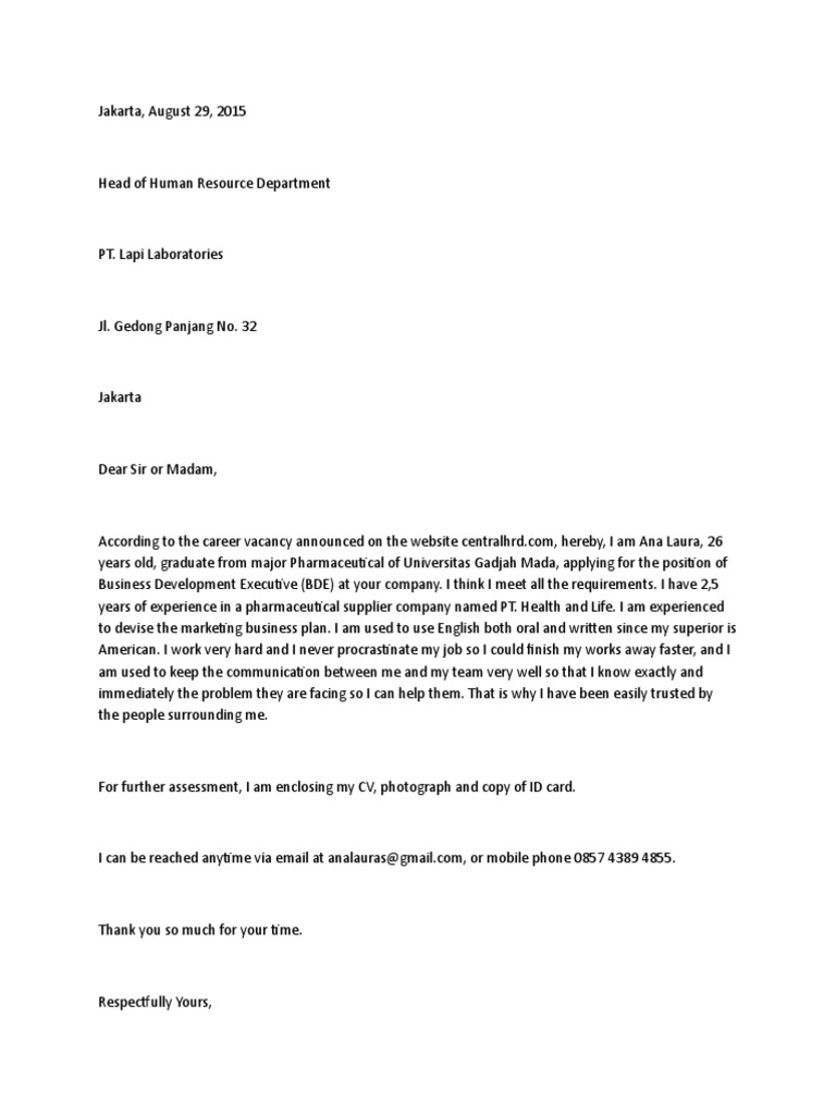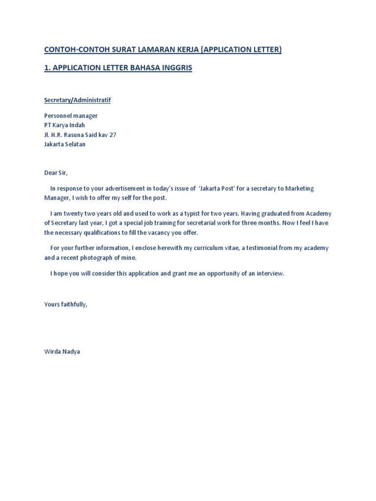 Baik dan benar surat lamaran pekerjaan dalam bahasa inggris dan artinya contoh surat penawaran barang dan harga lengkap contoh surat kuasa yang baik yoursfaithfully, abdulmalik. Untuk beberapa perusahaan tertentu, terkadang pihak perusahaan mengharuskan calon karyawannya untuk menguasai bahasa asing semisal bahasa inggris. Jangan membuka surat lamaran pekerjaan dengan salam sapaan 'hi' atau. Surat lamaran kerja biasanya dikirimkan untuk melamar sebuah posisi kerja di suatu perusahaan. Contoh surat lamaran kerja dalam bahasa inggris. Jika anda ingin melihat dan sedang mencari rekomendasi surat lamaran pekerjaan, mari kita simak contoh berikut ini Surat lamaran pekerjaan dalam bahasa inggris. Demikian surat lamaran pekerjaan ini saya buat, semoga saya diberikan kesempatan untuk melalui tahapan selanjutnya dalam seleksi penerimaan karyawan diperusahaan ini. Saya mencoba untuk meningkatkan karir yang sedang saya bangun dengan melamar pekerjaan di sekolah yang anda pimpin, sekaligus ingin terjun langsung. Dengan mengirimkan surat lamaran dalam bahasa inggris yang baik dan benar, berarti kamu account executive adalah istilah dalam bahasa inggris untuk pekerjaan sebagai staf pemasaran. Lb gramedia citra lestari hal : Untuk membuat surat lamaran bahasa inggris yang sesuai, anda perlu mengetahui terlebih dahulu fungsi surat lamaran pekerjaan bagi seorang pelamar. Surat lamaran kerja merupakan surat dari perseorangan yang bersifat resmi yang dalam penulisannya harus menggunakan tata bahasa yang baik dan sesuai meski demikian, ada beberapa perusahaan yang kerap mewajibkan palamarnya untuk membuat surat lamaran kerja berbahasa inggris.